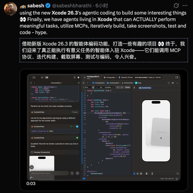 想要快速了解Xcode26.3可以看这个小哥的视频,速览一遍~